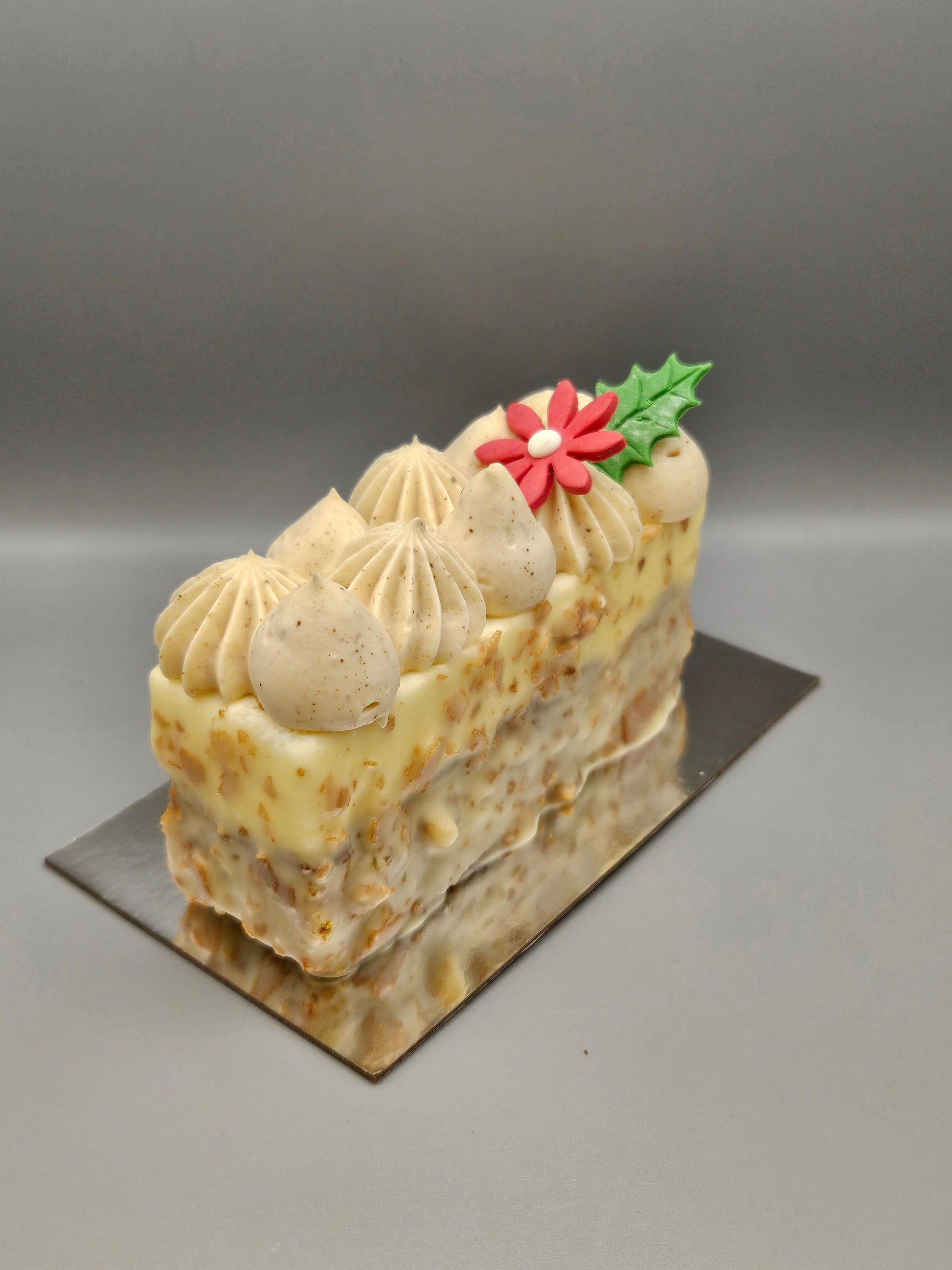 A layer of carrot cake, vanilla cheesecake mousse, topped with a cinnamon chantilly, and dipped in a white chocolate.