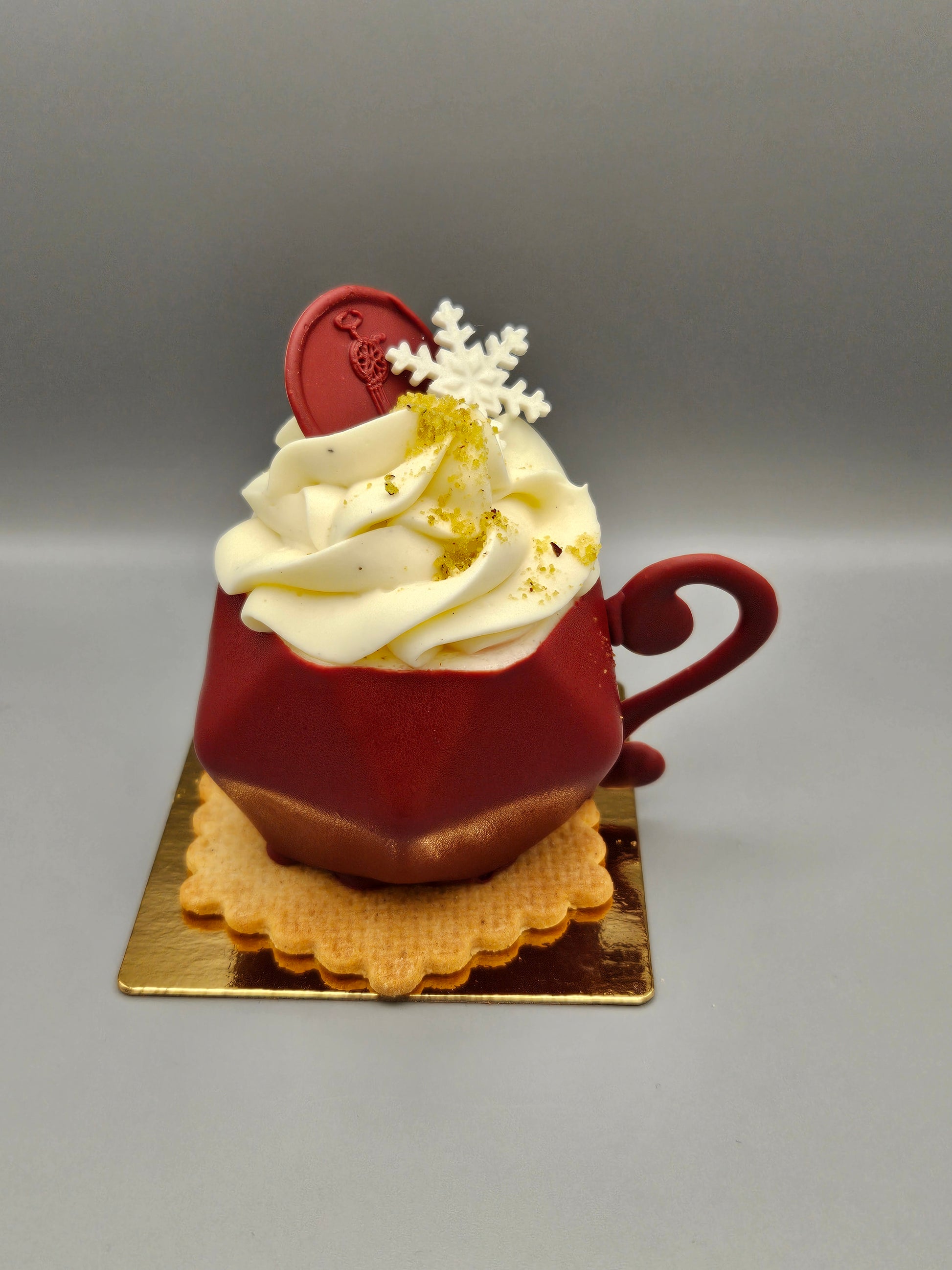 A cardamom cookie, sour cherry compote, pistachio anglaise, cardamom mousse.